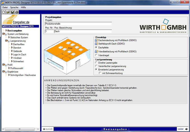 Mit dem Vorbemessungsprogramm WIRTH PROFIL-Designer EC3 realisieren Sie die Vorauswahl der Pfetten und Riegel für Ihr Bauvorhaben schnell und komfortabel nach DIN EN 1993-1-3, Anhang E.